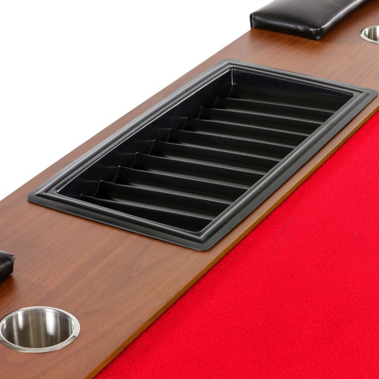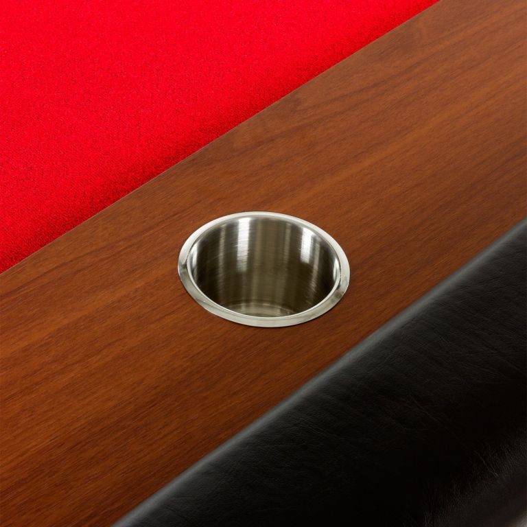 Deska stolu je velmi robustní, z jednoho kusu, o tloušťce 18 mm MDF desky. Půlkruhové masivní nohy z MDF zajišťují optimální stabilitu. Široká polstrovaná opěrka je připevněna k okraji stolu. Kromě toho, deska má více než 9 držáků nápojů z nerezové oceli. Vnitřek stolu je z mahagonového dřeva a nabízí dostatek prostoru pro uložení pokerových žetonů. Dokonalý zážitek z kasina tak může začít během několika minut!